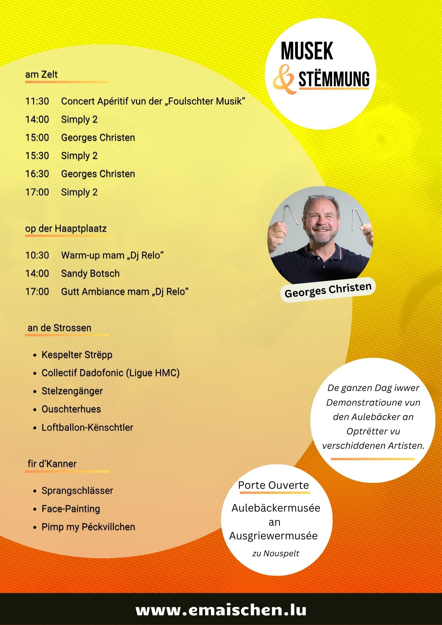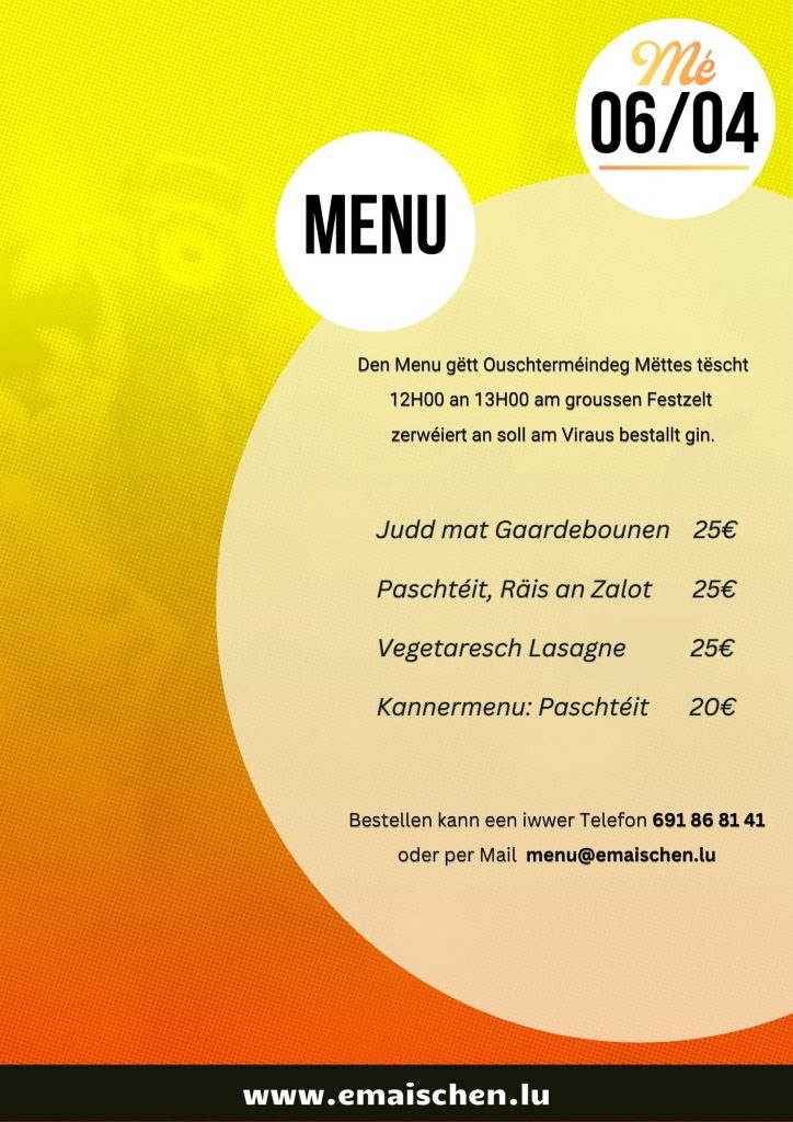 Op Ouschterméindeg fueren all 10 Minutten gratis Navetten vun de Parkingen vun der Zone Industrielle Kielen an vun der Zentralschoul Kielen op d’Emaischen.
